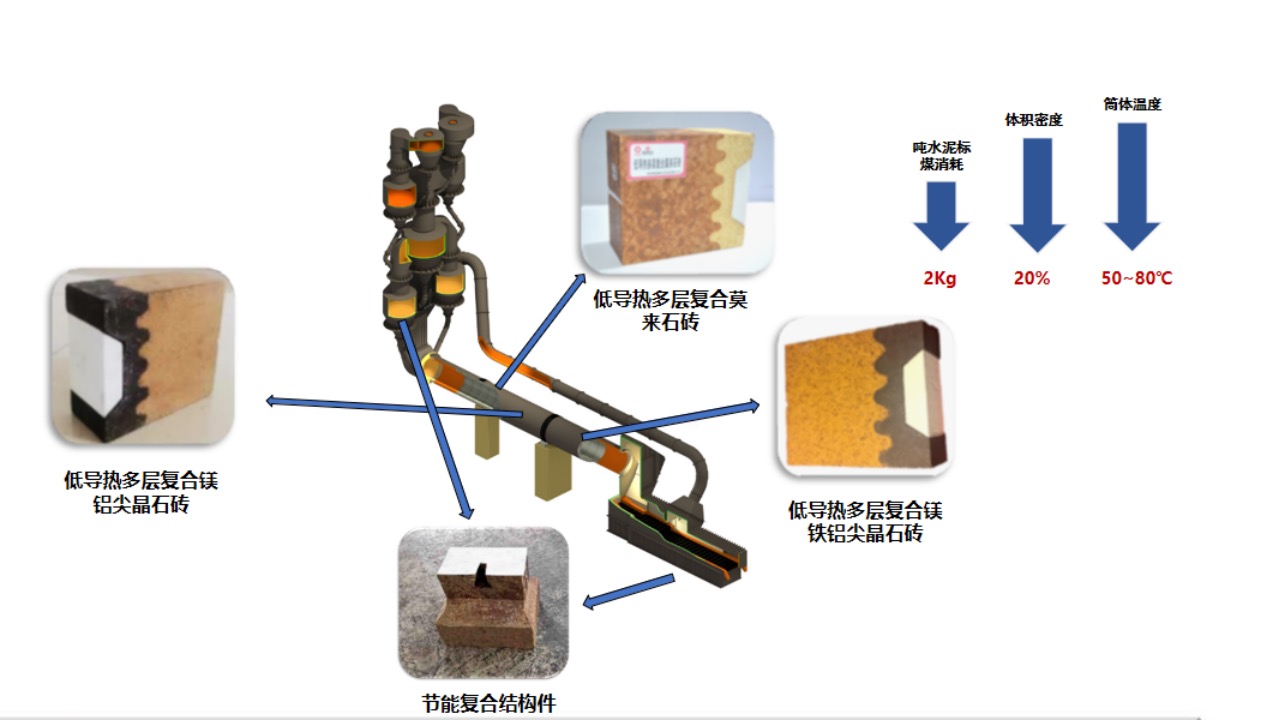 項目針對水泥行業(yè)碳排放較高的問題,充分研究了水泥窯不同區(qū)域熱量散失的問題,分析了水泥窯中不同耐火材料的使用效果和使用情況。采用梯度復合設計技術制備水泥窯用系列低導熱復合耐火材料,針對影響水泥窯散熱的關鍵部位水泥窯窯體、內襯高溫燒成帶、水泥窯中不定型部位,分別發(fā)明出節(jié)能復合磚、低導熱鎂鐵鋁復合尖晶石磚、節(jié)能復合結構件等多種節(jié)能高溫產(chǎn)品較好地解決了水泥窯散熱損失高的行業(yè)難題。通過減碳節(jié)能高溫材料的迭代創(chuàng)新與應用,降低了水泥窯碳排放,節(jié)能減碳效益顯著。